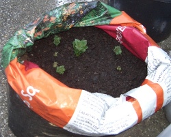 Pentru inceput gaurim fundul de la punga (pentru drenajul apei) si umplem partea de jos a geantii de plastic cu 5 cm de pamant organic (amestec pamant, compost, gunoi fermentat sau mranita) care a fost in prealabil umezit.
