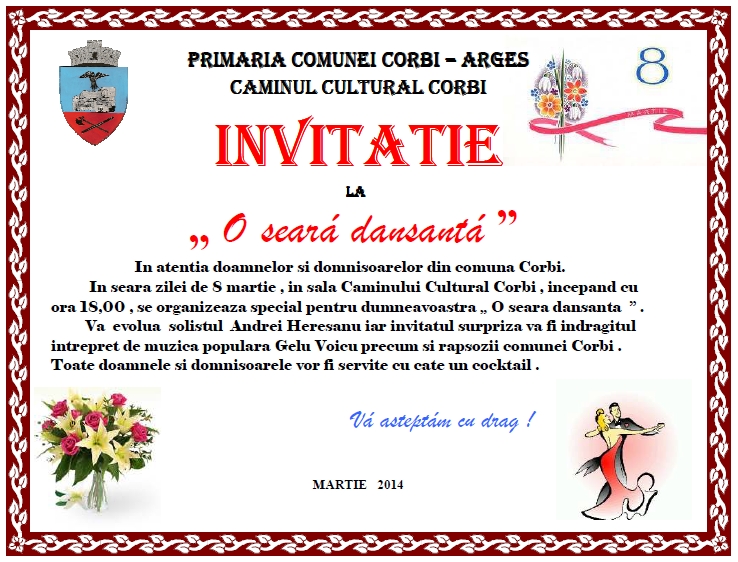 Balul Mărțișorului, un eveniment dedicat sosirii primăverii și Zilei Femeii, îi așteaptă pe toți locuitorii comunei, și în special pe doamne și domnișoare, la Căminul Cultural din Corbi. Organizarea acestui spectacol denumit ”O seară dansantă”, se datorează administrației locale care a considerat că un cadou mai potrivit nici că se putea pentru cetățeni.
