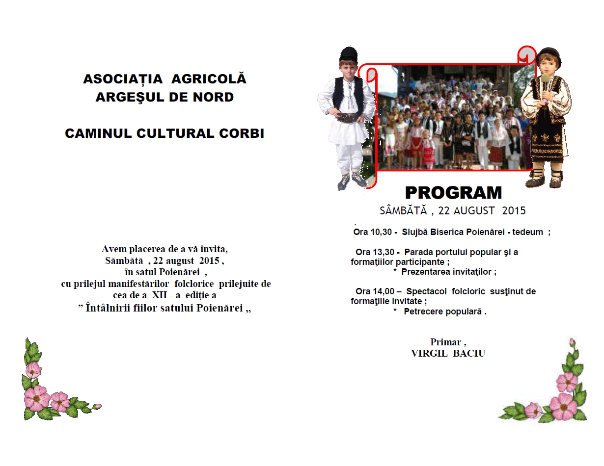 Sâmbătă, satul care-şi câştigase renumele de „picior de Paris” în perioada interbelică, după ce Armand Călinescu îi modernizase drumul, îşi va deschide larg porţile odată cu inimile localnicilor pentru fiii risipiţi prin lume şi pentru invitaţii lor. Este pentru al doisprezecelea an, fără pauze, când manifestarea iniţiată de tânărul om de afaceri, pe atunci, actualul primar al comunei Corbi, Virgil Baciu, adună oameni deosebiţi în cadrul unei sărbători de suflet, în care sunt omagiaţi martirii luptei anticomuniste şi cei care le onorează astăzi jertfele prin munca lor pentru propăşirea comunităţii locale. În decursul anilor, pe la sărbătoarea de la Poenărei au trecut personalităţi ca actorii Gheorghe Dinică, Alexandru Lulescu şi Doina Ghiţescu, solişti precum Ştefania Rareş sau scriitori ca Paul Everac – oameni care au fost şi au rămas „suflet în sufletul neamului lor”. Bineînţeles că în perioadele electorale pe acolo s-au îmbulzit şi destui politicieni, chiar când drumul de acces era un calvar, înainte de mandatul lui Virgil Baciu.