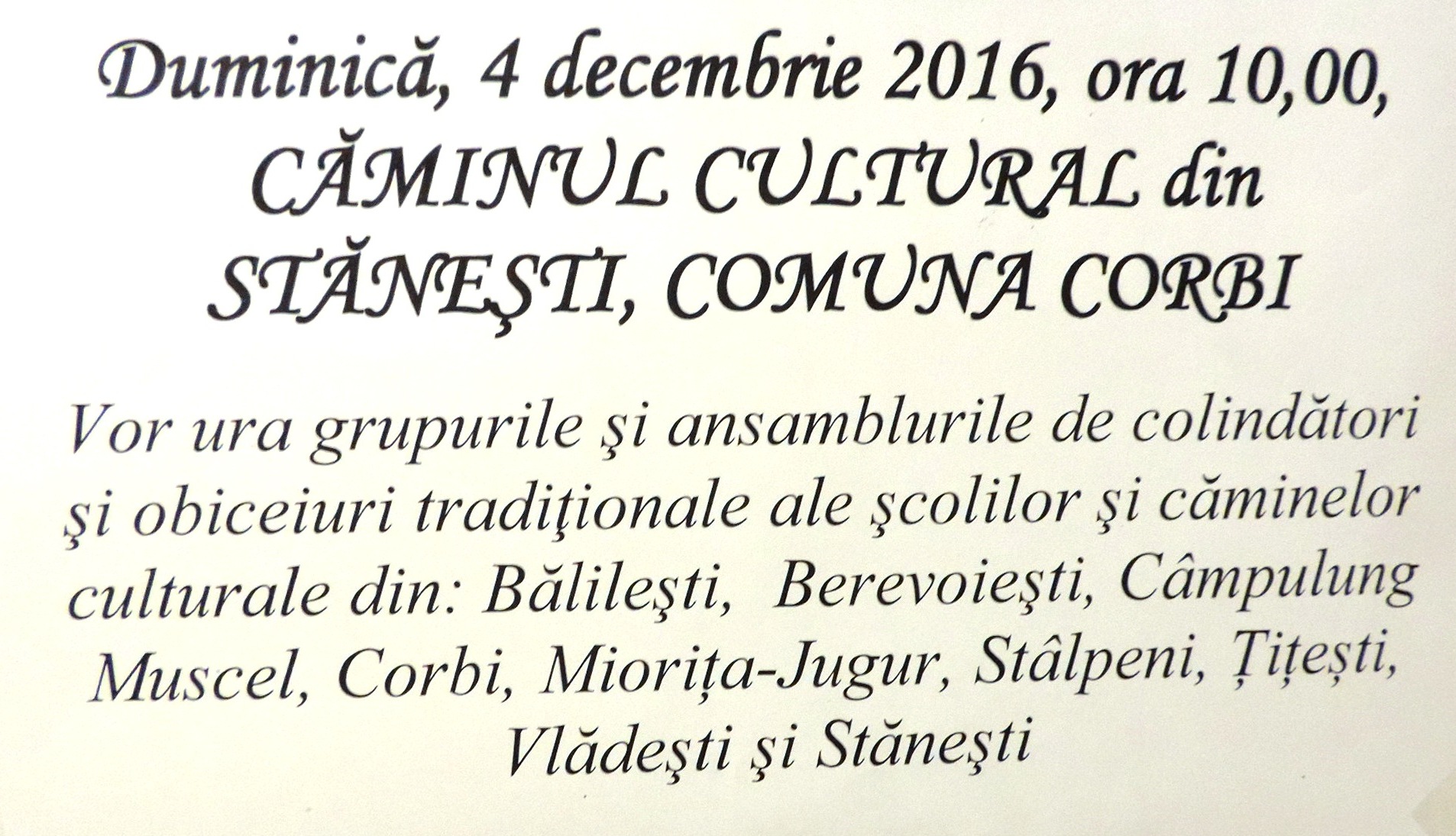 Duminica, 4 decembrie 2016 , ora 10.00 , Caminul Cultural din Stanesti , comuna Corbi , vor ura grupurile si ansamblurile de colindatori si obiceiuri traditionale ale scolilor si caminelor culturale din : Balilesti , Berevoiesti , Campulung Muscel , Corbi , Miorita -Jugur , Stalpeni, Titesti , Valadesti si Stanesti .